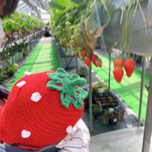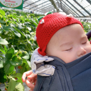いちごの可愛いお帽子を被った赤ちゃん(*´▽`*)